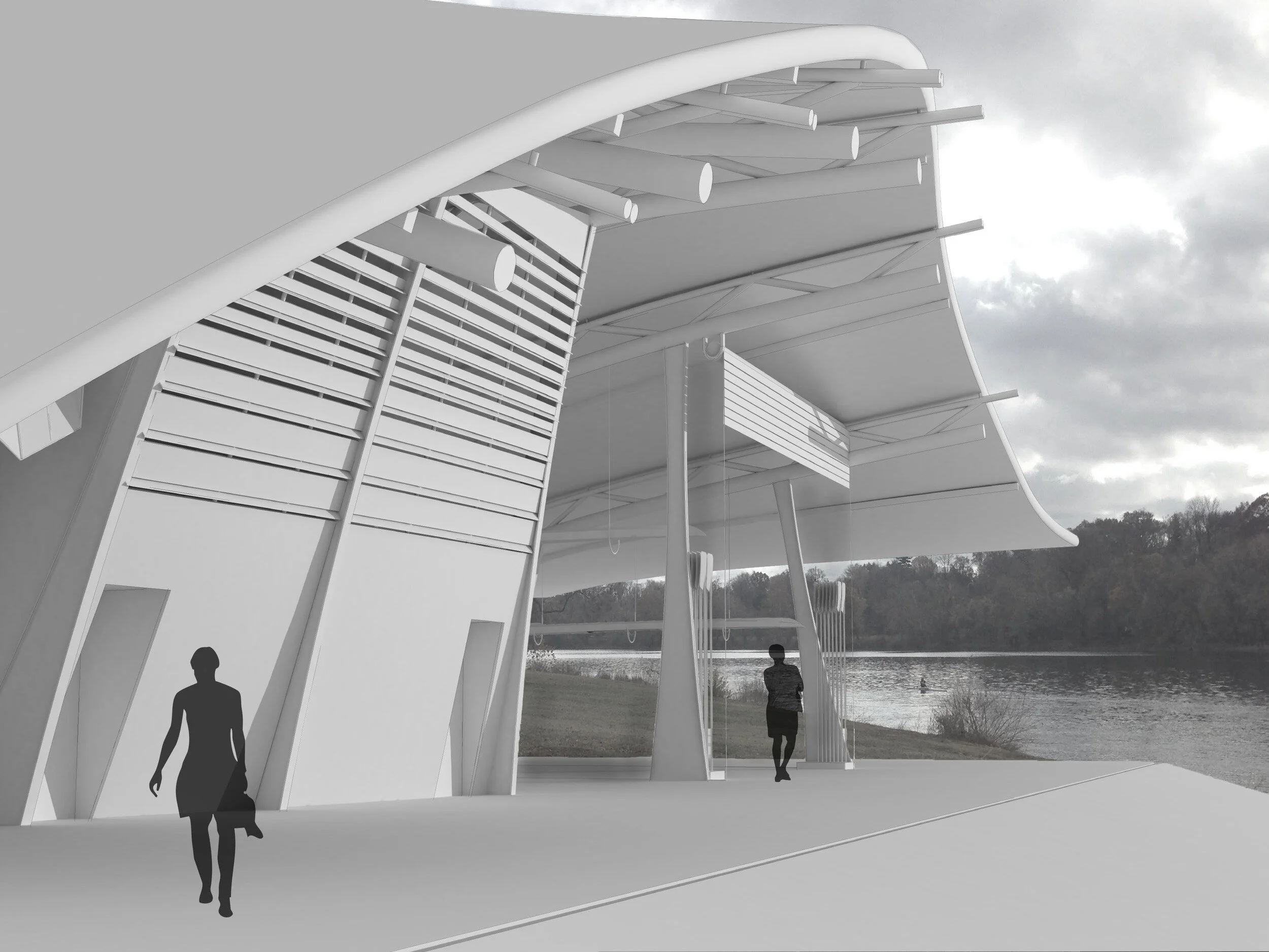 Geometrical analysis of motion through time of a rowing scull carried from racks to the dock edge of Penn's Schuylkill River boathouse. Resulting profile curves provide a geometric system of operations for the production of a doubly curved surface to serve as the roof for a boathouse design positioned upriver.